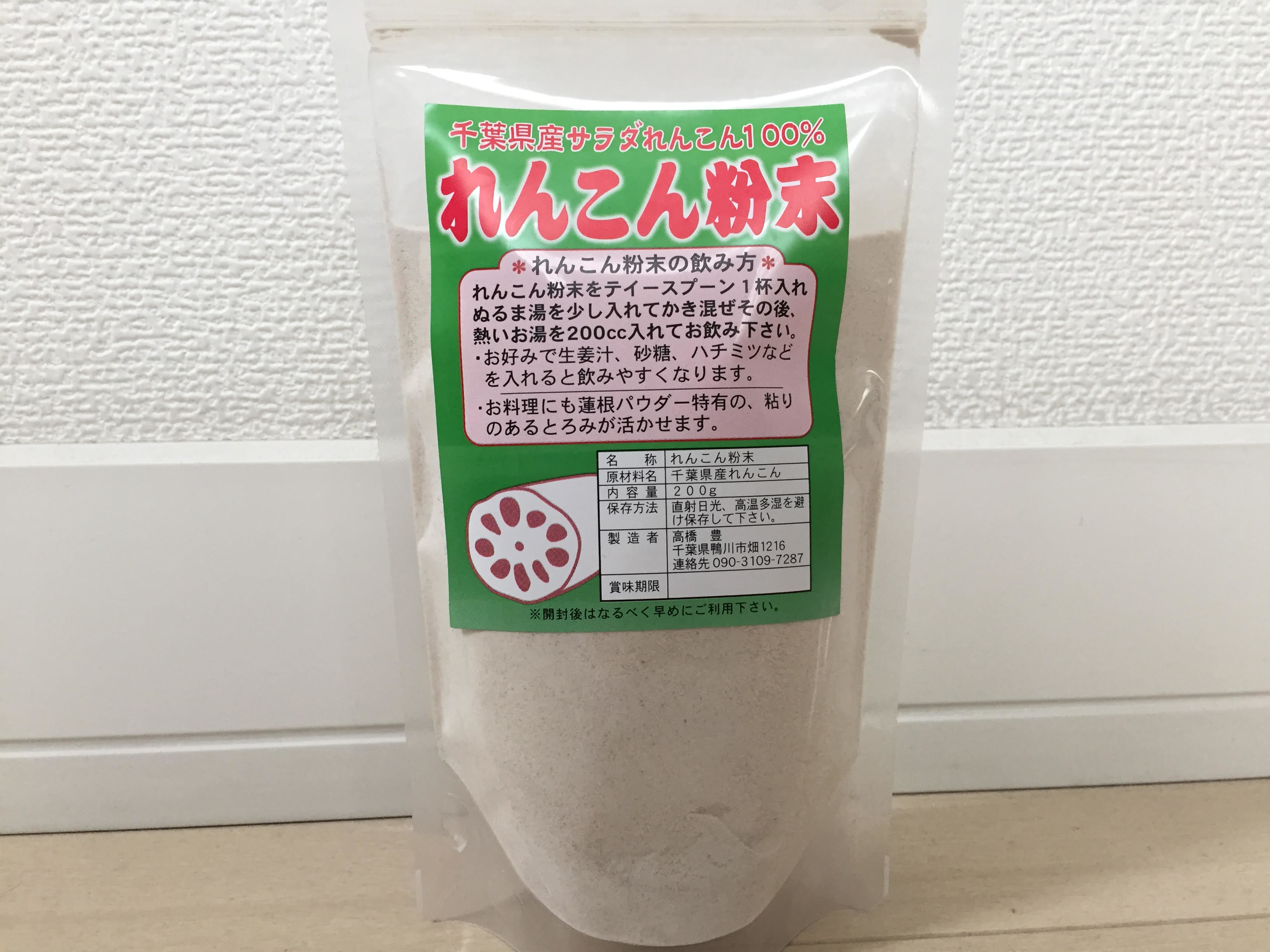 れんこん粉末をティースプーン1杯入れぬるま湯を少し入れてかき混ぜその後、熱いお湯を200cc入れてお飲み下さい。